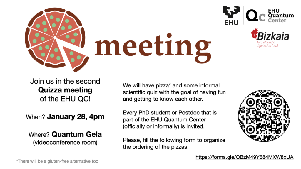 On January 28 at 4pm, the second Quizza Meeting of the EHU Quantum Center will take place. This is an event organized by and for the PhD students and postdocs of the EHU QC, where questions from different fields will be shared over a pizza in a fun quiz format style. The session will be held on January 28th at 4pm in the Quantum Classroom (Quantum Gela) of the Faculty of Science and Technology.